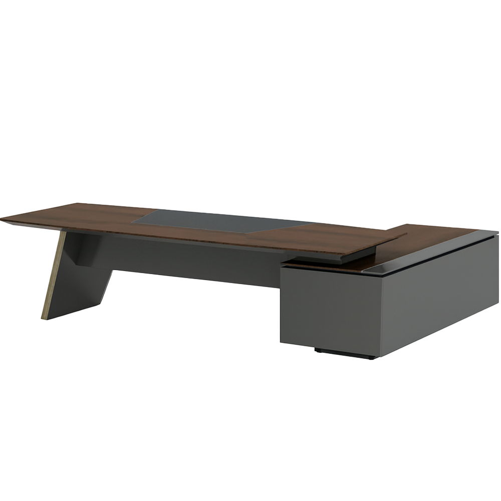 - Эстетичный дизайн: Стол выполнен в роскошном коричневом цвете, который придает интерьеру солидность и профессионализм. В отделке использованы премиальные материалы, подчеркивающие статус руководителя.