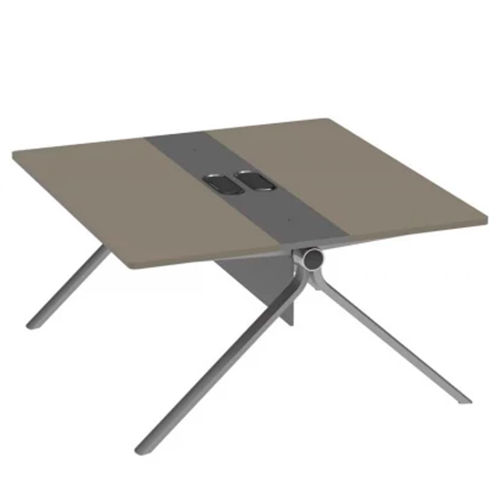 Центральная вставка с кабель-люками обеспечивает аккуратную организацию проводов и подключение техники. Скошенные металлические опоры обеспечивают визуальную лёгкость и устойчивость конструкции. Стол идеально подходит для open space, гибких офисных пространств и рабочих кластеров.