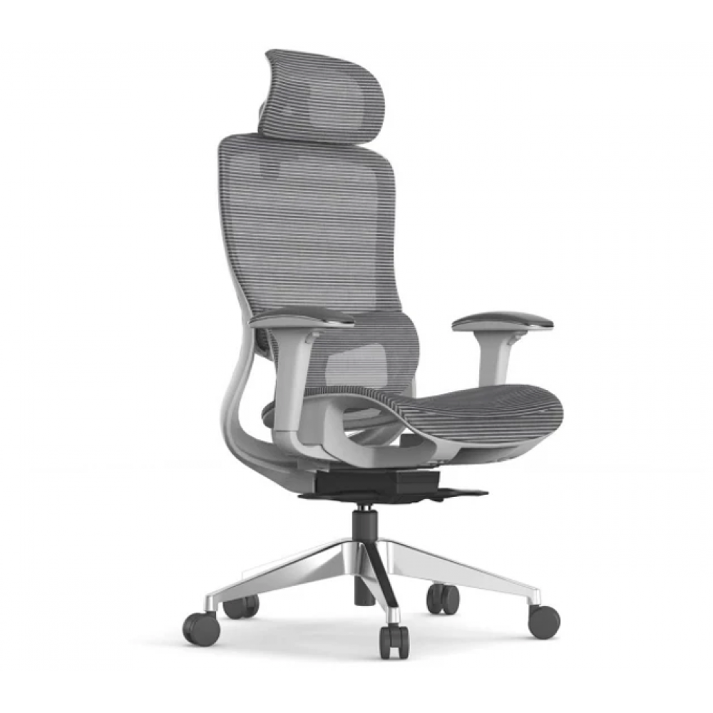 Спинка кресла выполнена из прочной дышащей сетки серого цвета, которая обеспечивает естественную вентиляцию и комфорт в течение всего рабочего дня. Эргономичная форма спинки с поддержкой поясницы способствует правильной осанке и снижает нагрузку на спину.