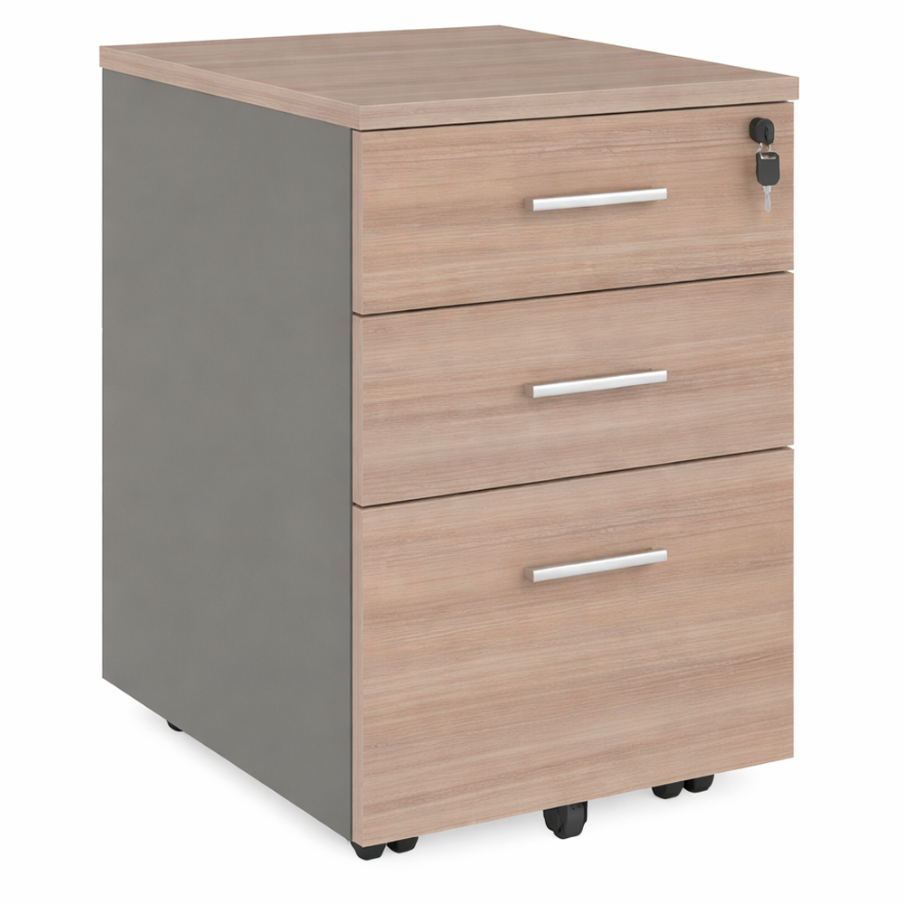 Тумба выполнена из прочного меламина, устойчивого к износу и ежедневной эксплуатации. Комбинация оттенков придаёт изделию современный и универсальный внешний вид, который легко сочетается с офисными столами и шкафами серии KANO. Оснащение колёсами позволяет свободно перемещать тумбу внутри рабочего пространства.