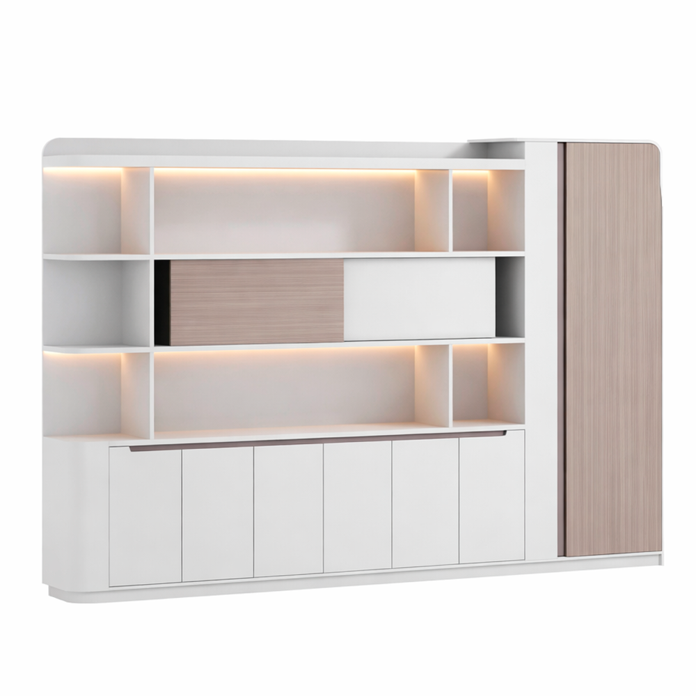 Хранение: Просторные модули для хранения с открытыми и закрытыми секциями, обеспечивающие удобный доступ к документам и личным вещам.