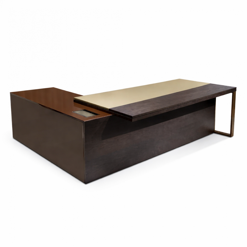 Массивная конструкция с интегрированной тумбой формирует монолитный образ, подчёркивающий уверенность и лидерство. Рабочая поверхность отличается увеличенной глубиной, что обеспечивает комфорт при работе с документами, ноутбуком и аксессуарами. Чёткие линии, минималистичный дизайн и благородный коричневый оттенок делают стол универсальным решением для кабинетов премиум-класса.
