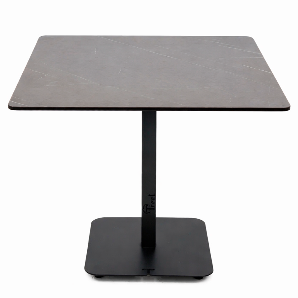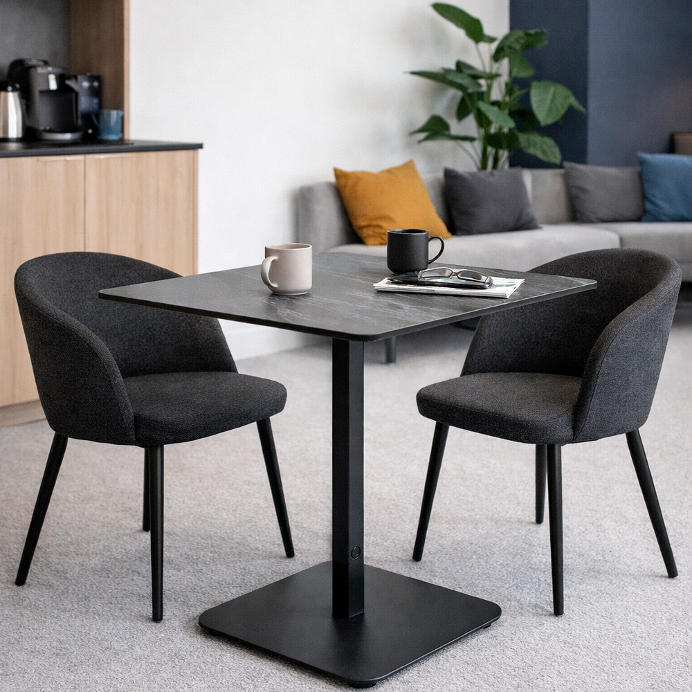 Компактный квадратный формат делает стол удобным для небольших помещений, а строгая центральная опора обеспечивает комфортную посадку без лишних перекладин и ограничений для ног.