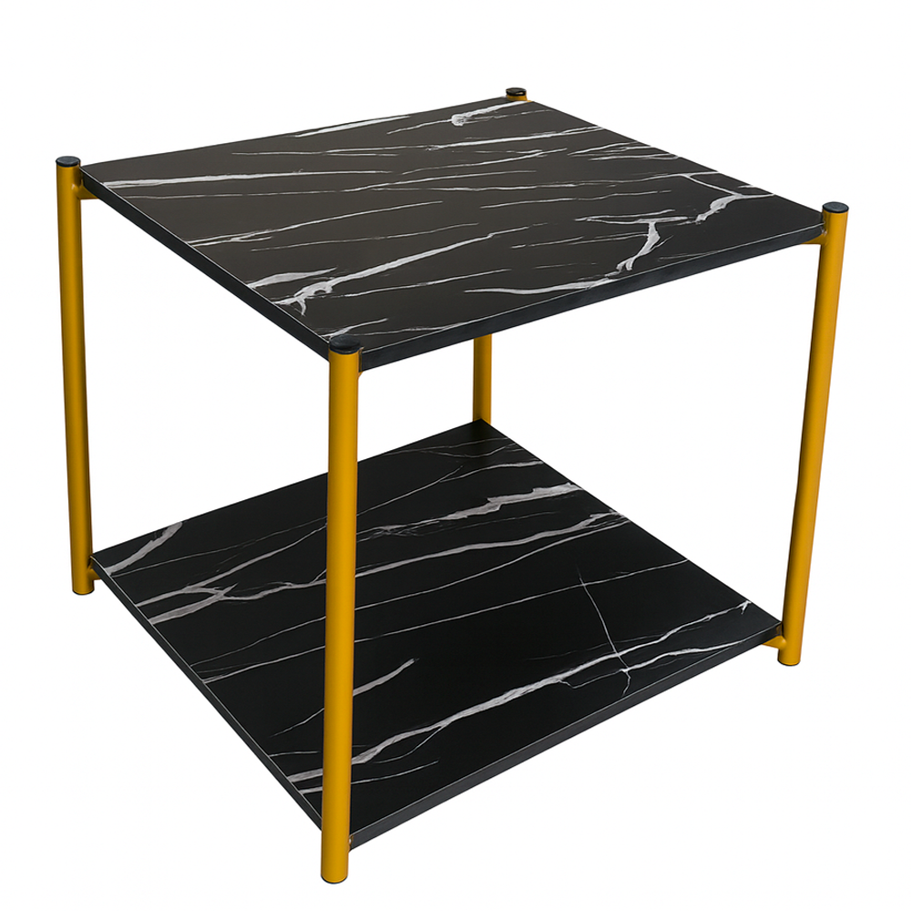 Столешницы выполнены в эффектном мраморном декоре с выразительными светлыми прожилками, что придаёт изделию статусный и аккуратный внешний вид. Двухуровневая конструкция обеспечивает удобство использования: верхний уровень — для напитков, гаджетов и аксессуаров, нижний — для журналов, документов или декора.